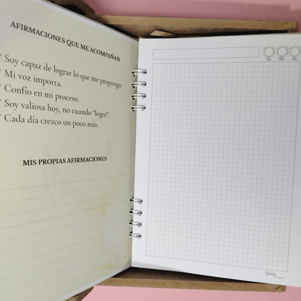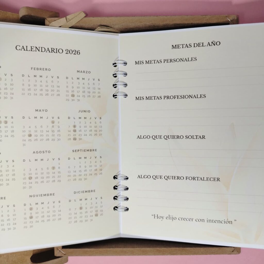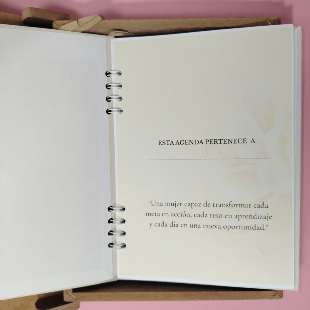 Cada agenda incluye detalles especiales como una hoja de pertenencia con frase inspiradora, espacio para metas y afirmaciones, calendario y páginas cuadriculadas para la organización diaria.